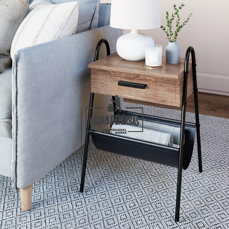 Gazete, dergi ve kitabınızı okuduktan sonra salonunuzun bir köşesinde veya tekli koltuğunuzun hemen yanında bulunduracağınız bu çekmeceli sehpa modelimizin altında gazete, dergi ve kitap koyma yeri olan 1 çekmeceli ferforje ve ahşap tan yapılmış en güzel sehpa modellerinden biridir.